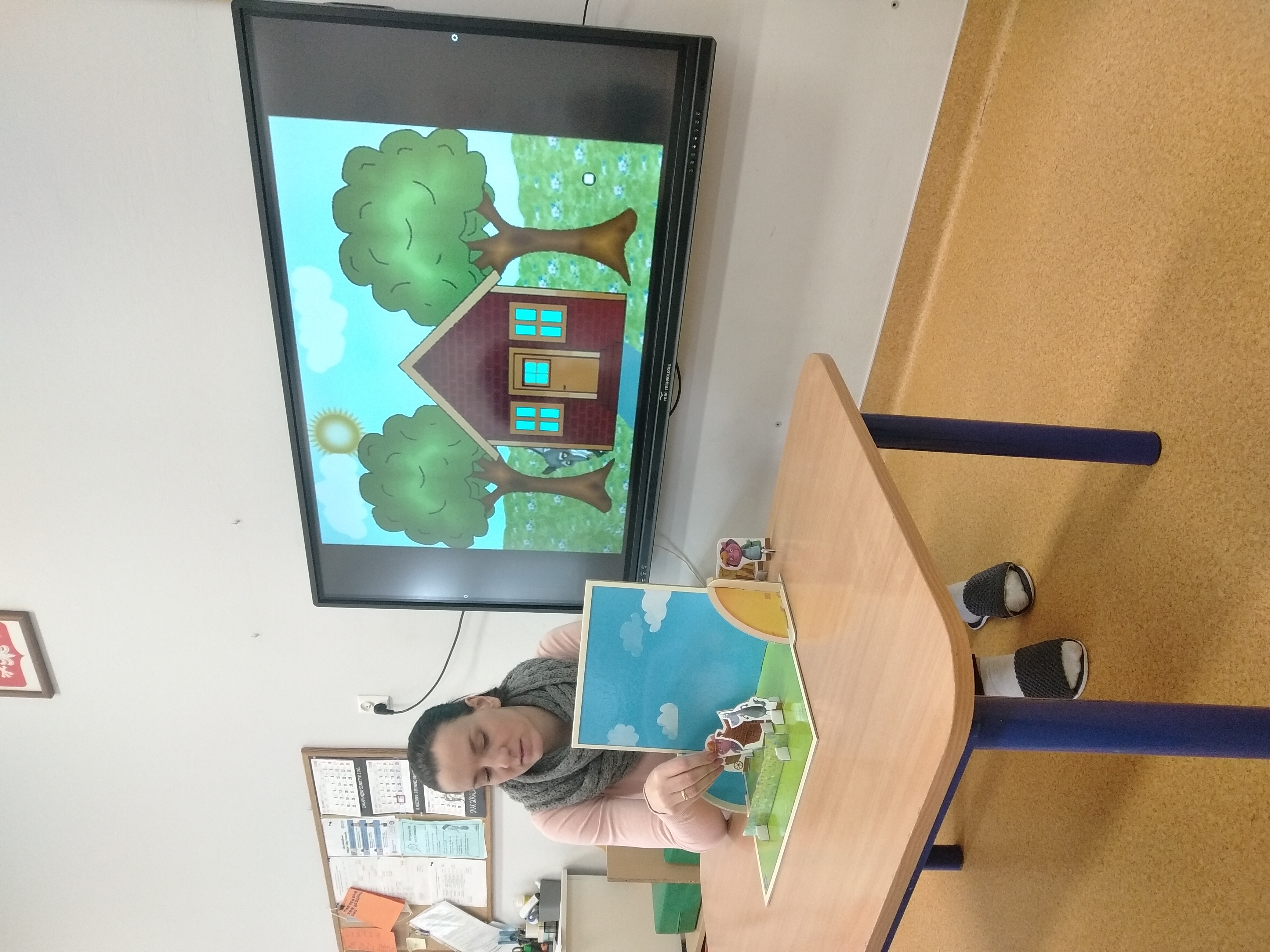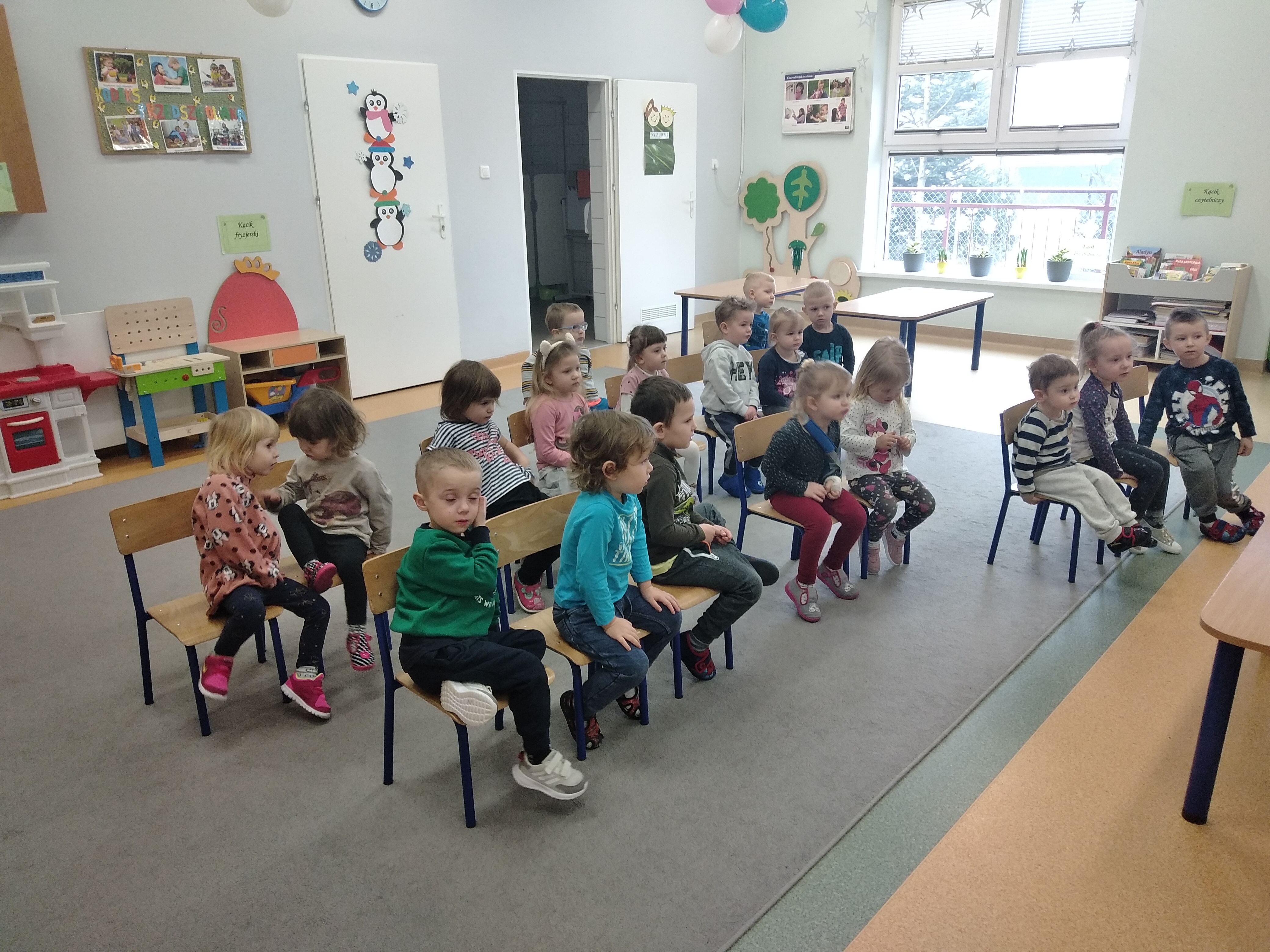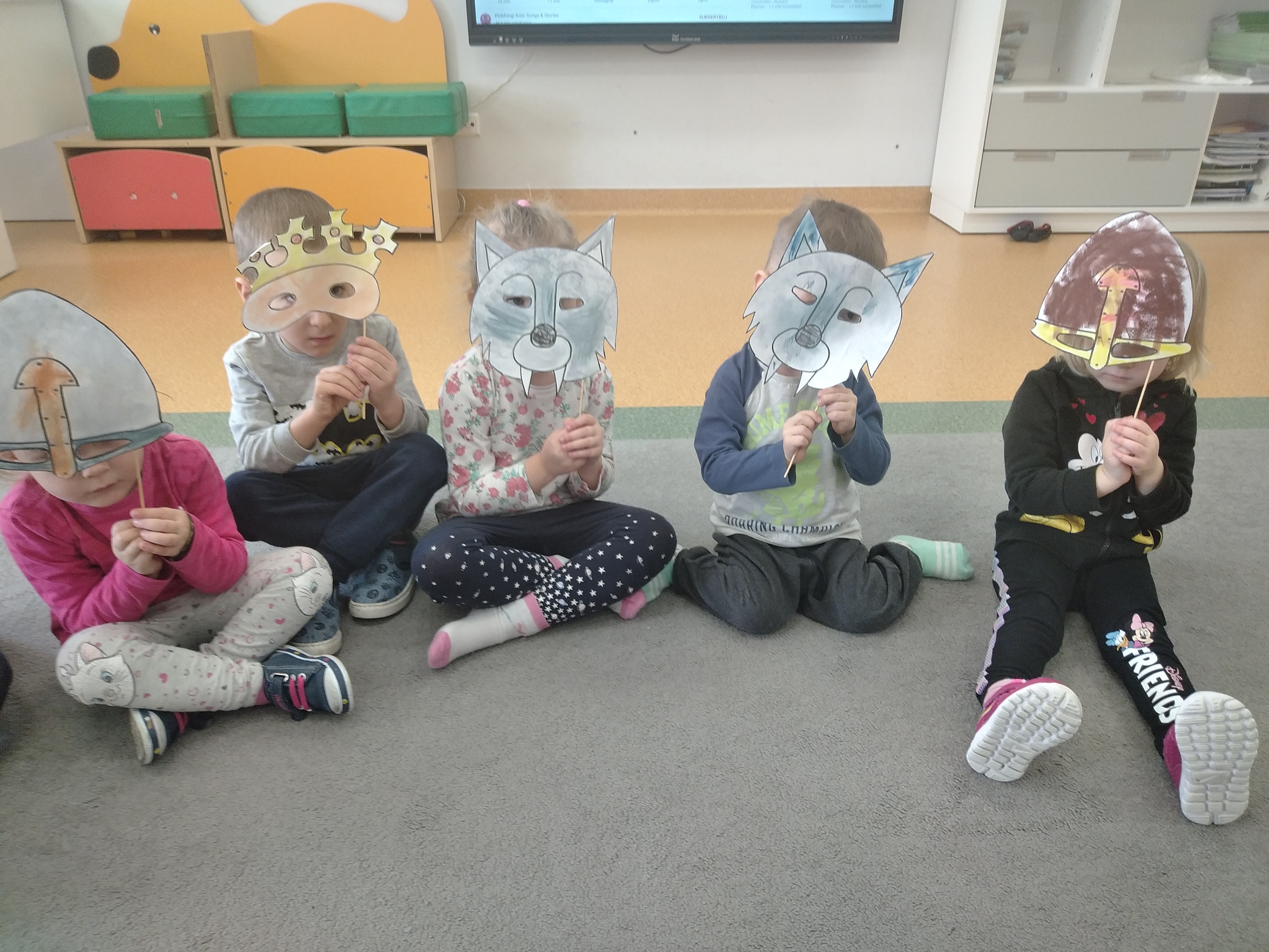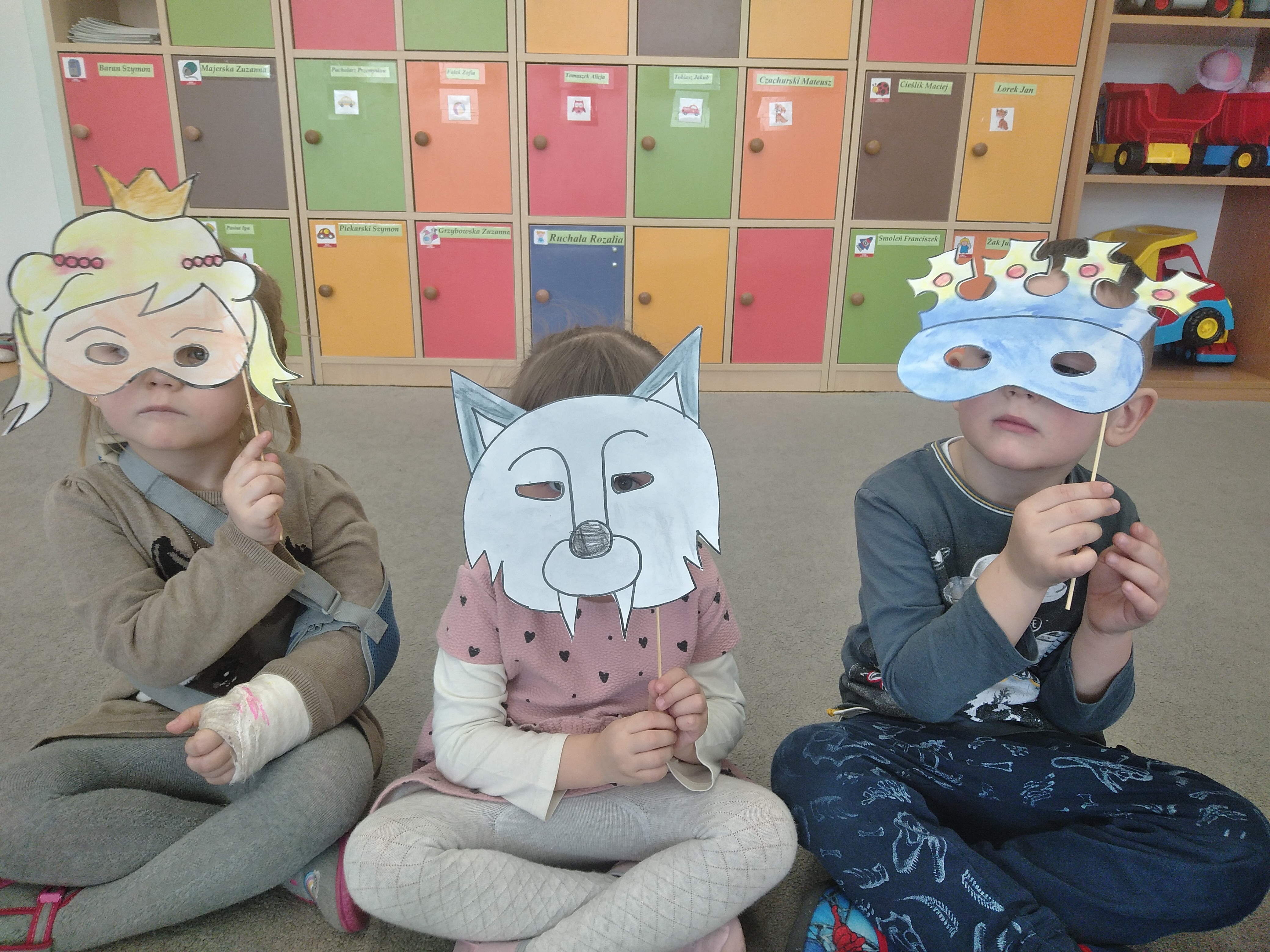 Krasnoludki rozmawiały o teatrze. Dzieci między innymi zapoznały się z zawodem aktora, obejrzały bajkę pt. "Trzy świnki" oraz własnoręcznie wykonały maski teatralne