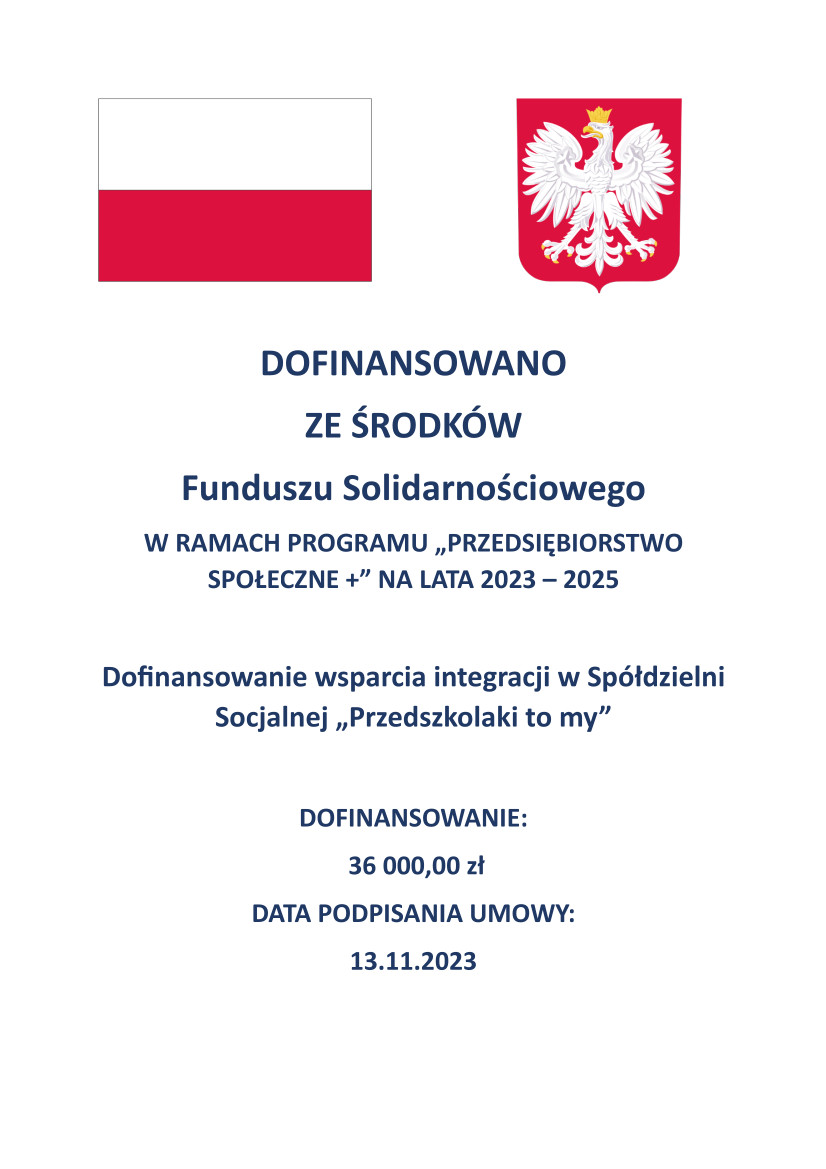 Spółdzielnia Socjalna "Przedszkolaki to my" otrzymała dofinansowanie w ramach Programu Przedsiębiorstwo Społeczne + na lata 2023-2025 na