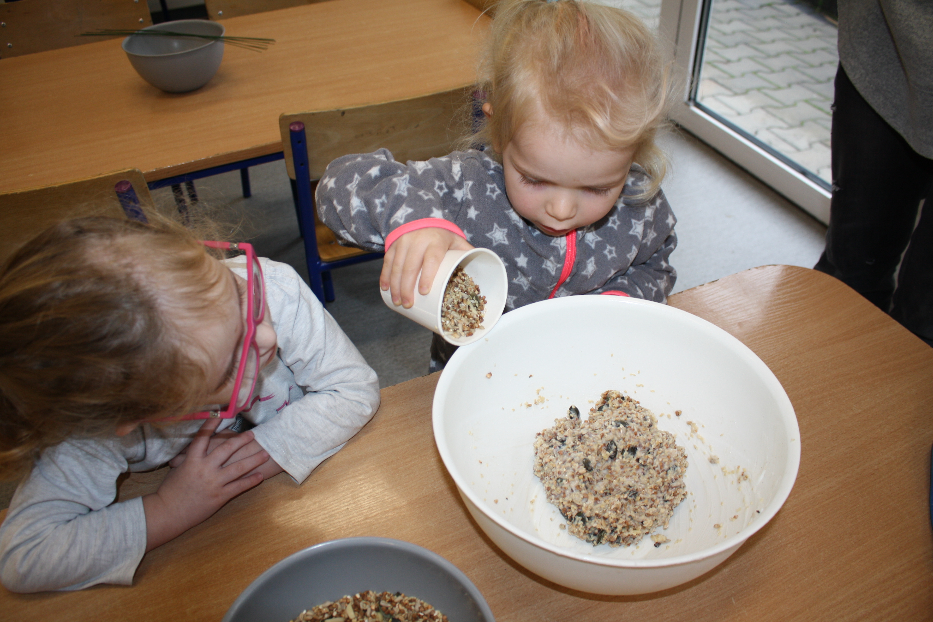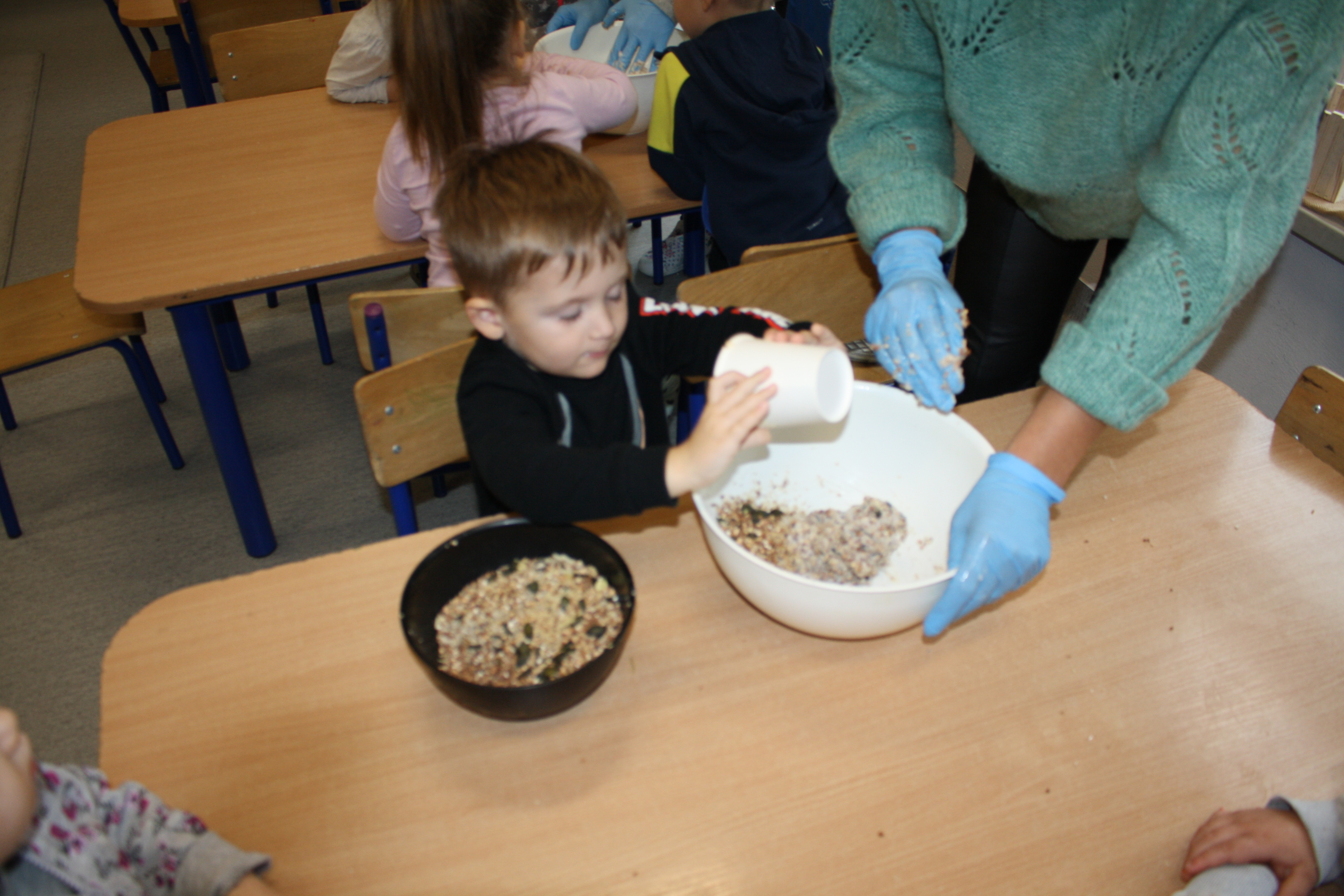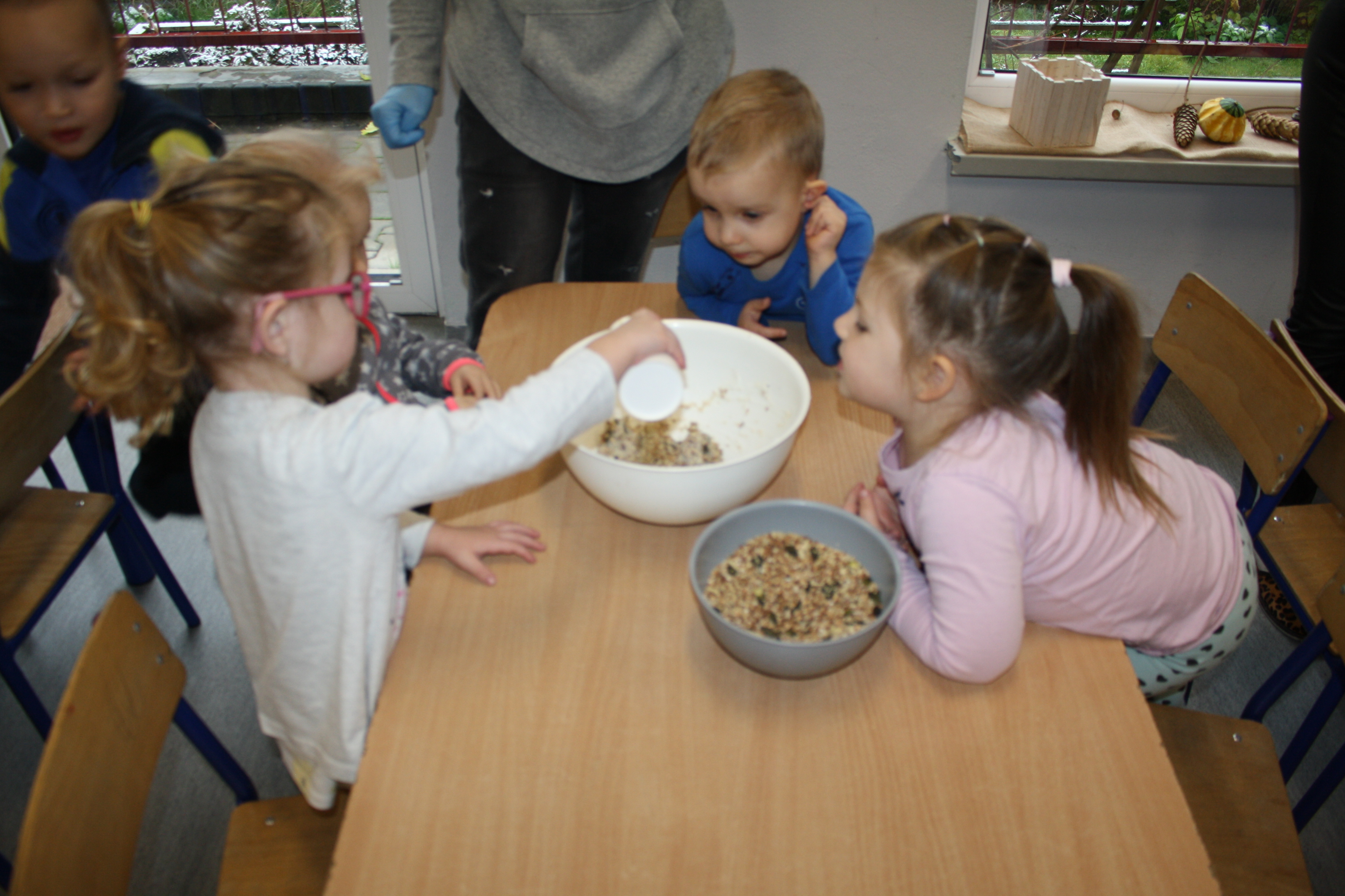 W ramach tematu dotyczącego przygotowania ptaków do zimy Żabki poznały różne rodzaje zwierząt i ptaków. Dowidziały się, jak można im pomagać i kiedy to robić. Pomalowały karmnik oraz przygotowały przekąski dla zimowych przyjaciół